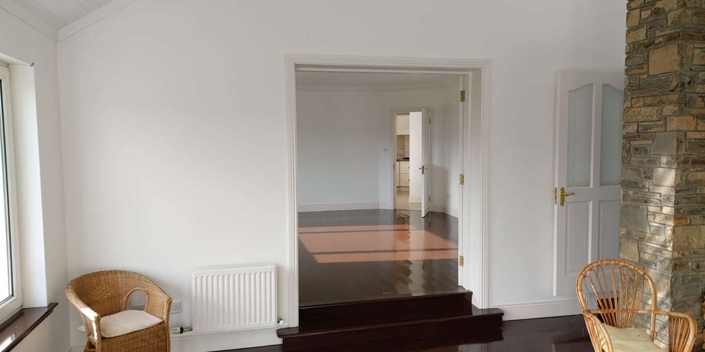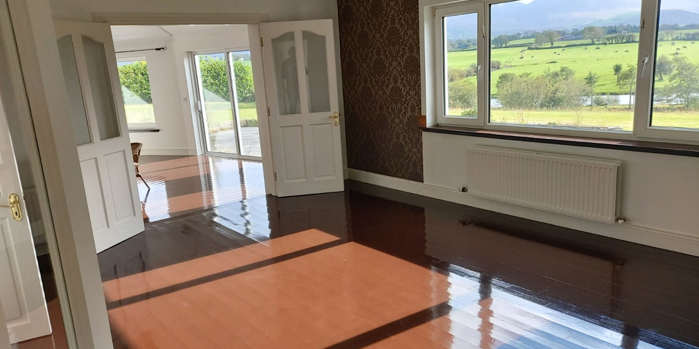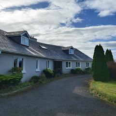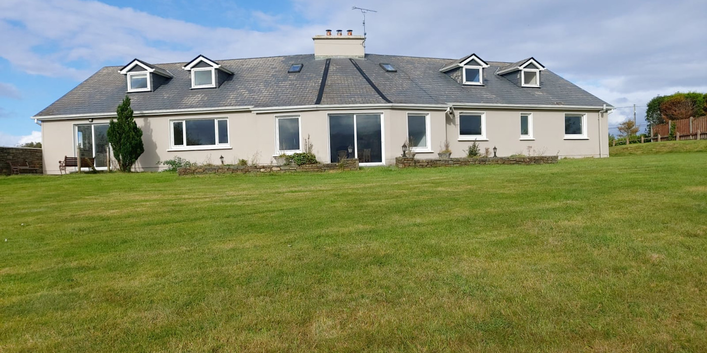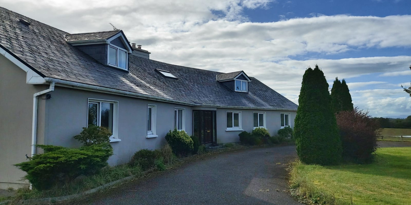 It is comprised of a very large welcoming hall with a fireplace and stairs. A very large fully fitted kitchen with a dining area and patio doors, large utility, large dining-room, large lounge with patio doors and an open fireplace with a solid fuel stove. There are 4 very large double bedrooms downstairs, all with big en-suites. There is a big bathroom downstairs with a jacuzzi bath. Downstairs also has an office . There is further accommodation upstairs if required. It has oil fired C/H with double glazed PVC windows and doors.