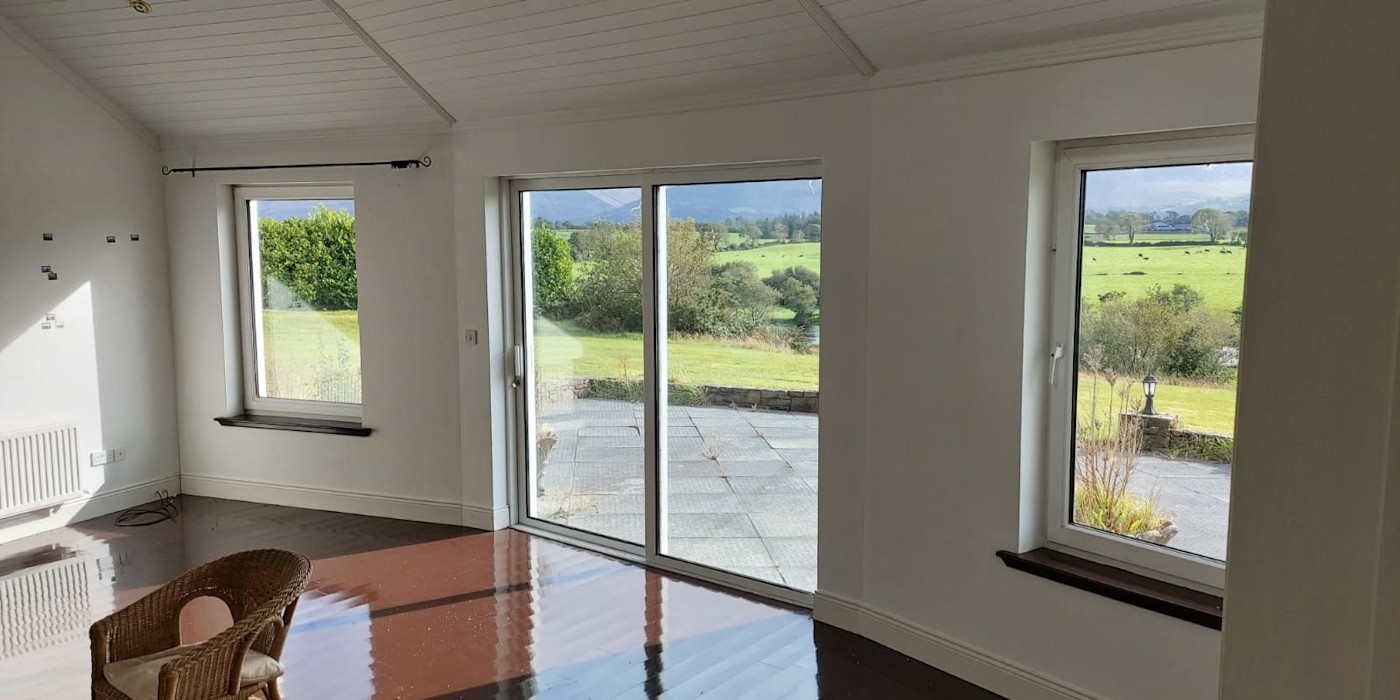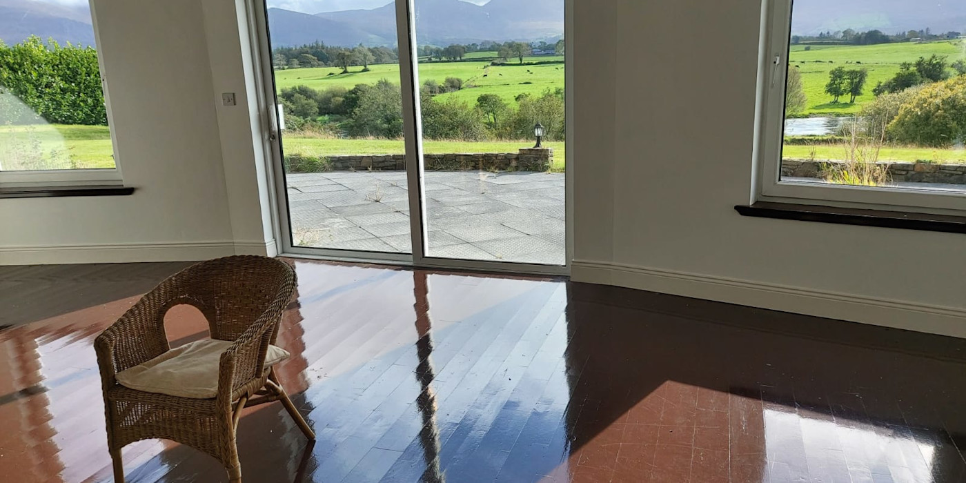 It comes with a detached, studio apartment/office. This building has cavity walls and slated roof etc. It is fully wired and plumbed with hand basin and w/c and provision for a shower to be fitted. The house stands on over 2 acres. It is on the main- Ring-Of-Kerry -Road. It has extensive frontage on to the river Laune, a renowned salmon river. Fishing Rights to the river are included in the sale. It looks directly on to the river and to the MacGillycuddy Reeks and Ireland’s highest mountain Carrauntoohil. There are beautiful views of the river and mountains from almost all rooms.